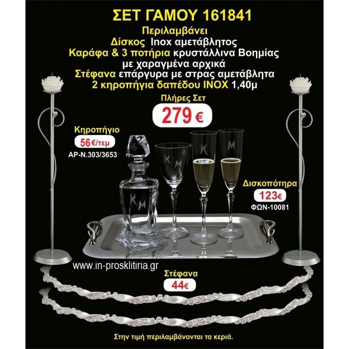 Η τιμή περιλαμβάνει 2 κηροστάτες δαπέδου (ινοξ,μπρονζέ η σκουριά) στέφανα επάργυρα αμετάβλητα,δίσκος ινοξ αμετάβλητος,μποτίλια κρυστάλλινη,3 ποτήρια κρυστάλλινα.