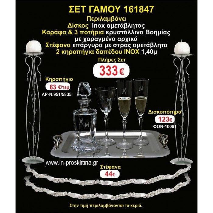 Η τιμή περιλαμβάνει 2 κηροστάτες δαπέδου (ινοξ,μπρονζέ η σκουριά) στέφανα επάργυρα αμετάβλητα,δίσκος ινοξ αμετάβλητος,μποτίλια κρυστάλλινη,3 ποτήρια κρυστάλλινα.