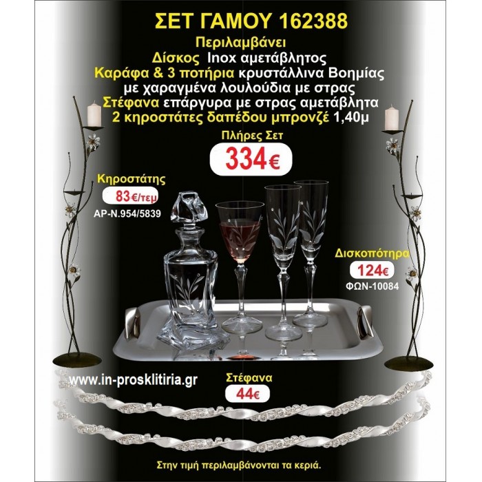 Η τιμή περιλαμβάνει 2 κηροστάτες δαπέδου (ινοξ,μπρονζέ η σκουριά) στέφανα επάργυρα αμετάβλητα,δίσκος ινοξ αμετάβλητος,μποτίλια κρυστάλλινη,3 ποτήρια κρυστάλλινα.