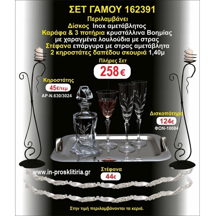 Η τιμή περιλαμβάνει 2 κηροστάτες δαπέδου (ινοξ,μπρονζέ η σκουριά) στέφανα επάργυρα αμετάβλητα,δίσκος ινοξ αμετάβλητος,μποτίλια κρυστάλλινη,3 ποτήρια κρυστάλλινα.